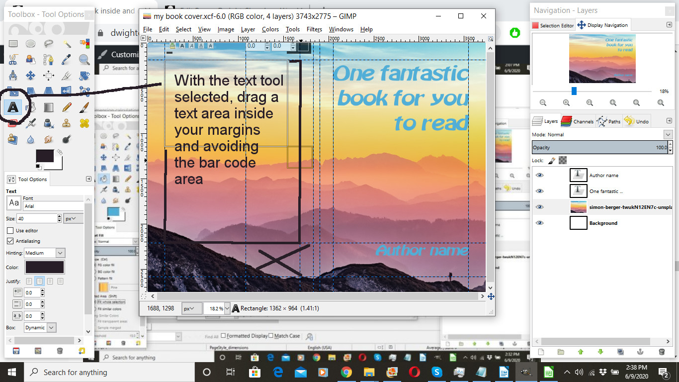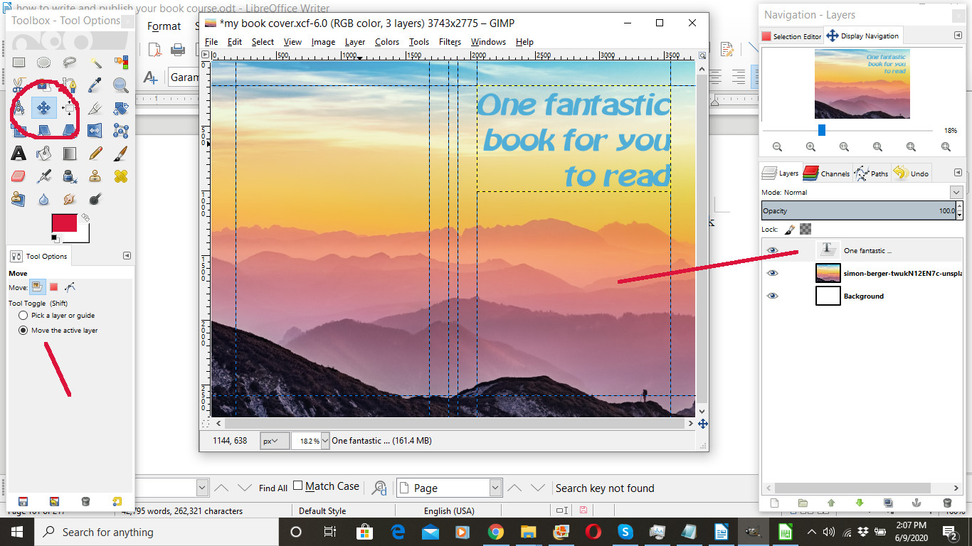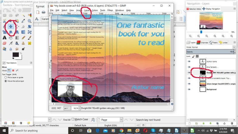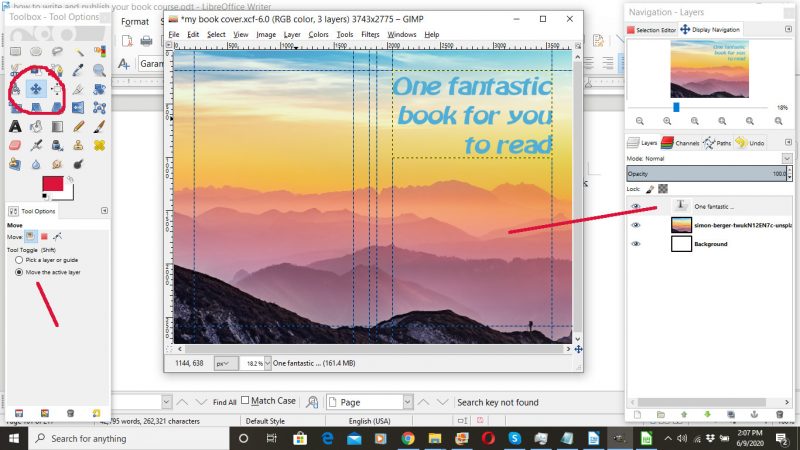 Next I used my cross-shaped move tool to move the text layer (containing the book’s title) to the place I want it. Here I aligned it with the front cover margins. Be sure you have the correct layer selected on the right, and in the tool settings on the lower left, select “Move the active layer.”