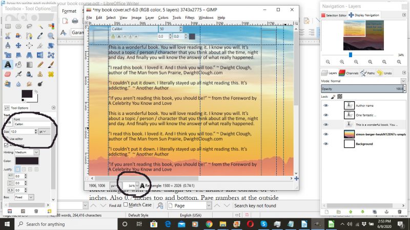 For the text (or copy) on the back cover, use your color pick tool to select an appropriate color. Choose a readable font. I chose Calibri. Adjust your zoom to 34% as I’ve found that gives me about the same dimensions on my screen as the printed book itself will be. I changed the size selection measurement from pixels to points, and chose 12 points for my back cover text. (I wouldn’t go much smaller than that.) Then I composed my back cover copy in LibreOffice. Then I copied and pasted it into the text area.