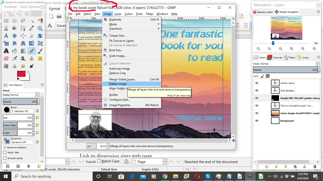 Making sure we’re in the new file we just created, we next want to flatten the image. We flatten the image because the flattened image will export more easily to PDF, and we are aiming to create a PDF version of the cover.