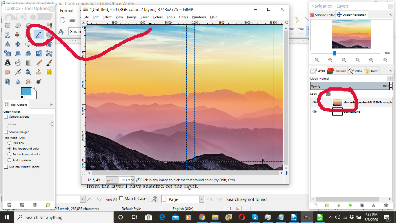 Next let’s pick a color for the text we’re going to use on the front cover. I’ll do this by using the color picker tool to choose a color from the layer I have selected on the right.