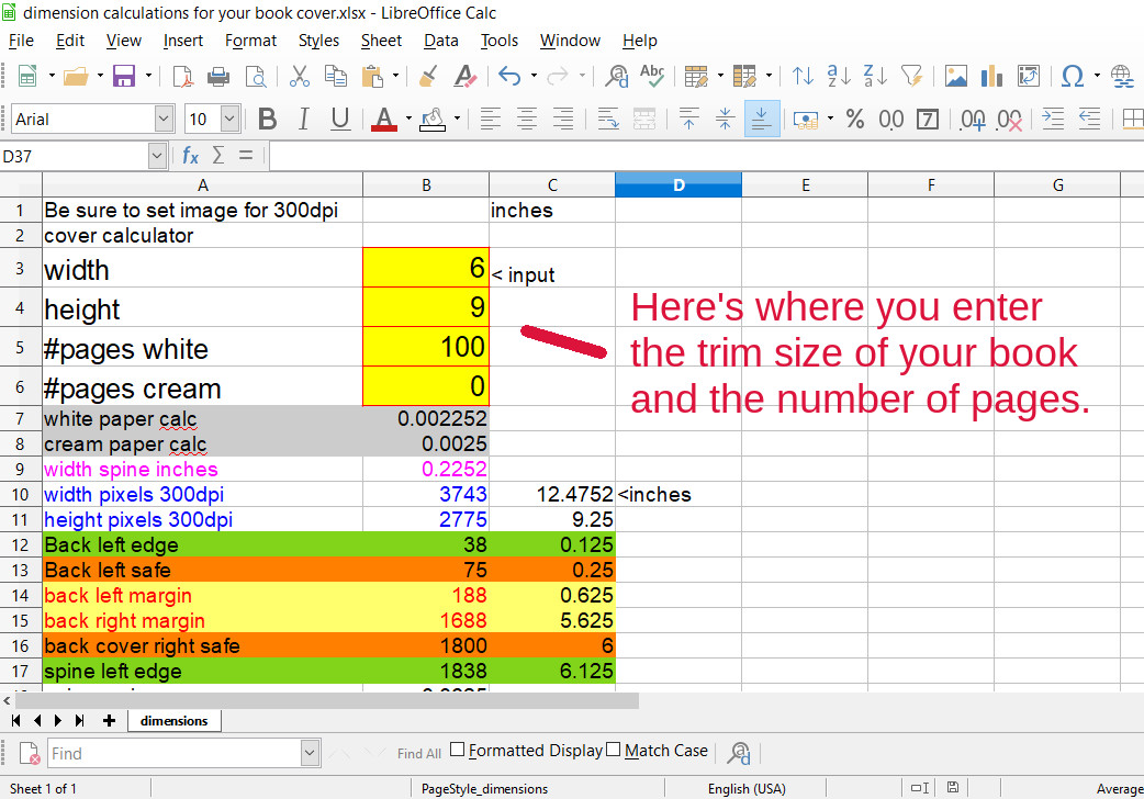 For our example cover, we’re going to say that our trim size is 6×9 inches, and we have 100 pages in our book. You can adjust these numbers to fit your own book’s properties. Once you do, all the other numbers on the page should update.
