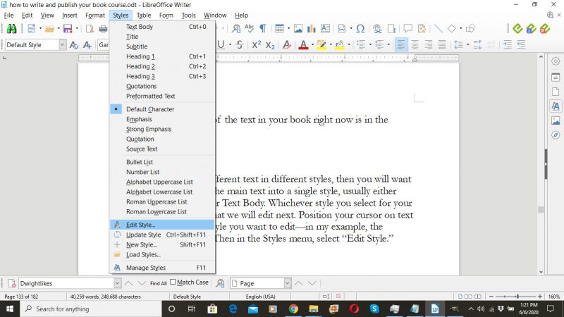 If you have different text in different styles, then you will want to convert all the main text into a single style, usually either Default Style or Text Body. Whichever style you select for your main text is what we will edit next. Position your cursor on text that is in the style you want to edit—in my example, the Default Style. Then in the Styles menu, select “Edit Style.”