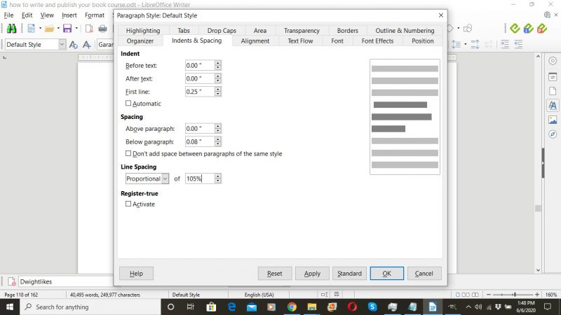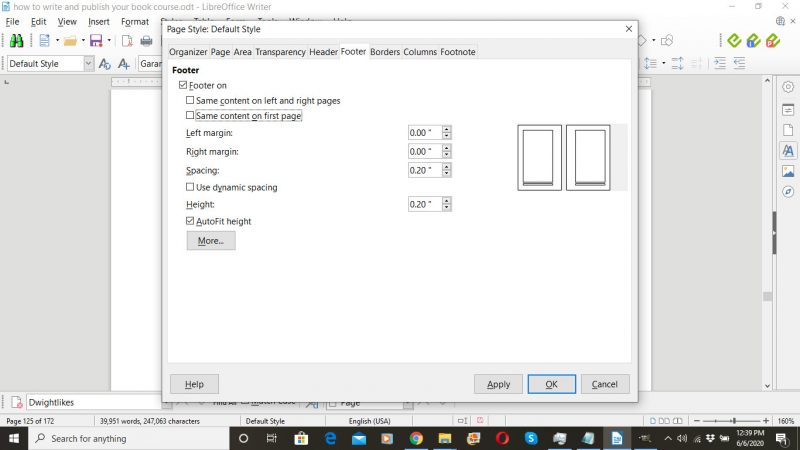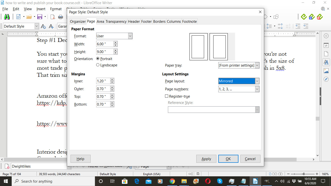 In LibreOffice, choose the page tab, and enter your trim size. In this case, I went with 6×9. Then you’ll want to select “mirrored” margins. You want to set your inner margin at 1.2 and all the other margins at 0.7. The inner margin is the part of your book that will be next to the binding. When you open the page, less of that side of the page will be visible. That’s why you want to set a greater margin on the inside. You can play with these settings a bit, but I’ve tried different settings and these seem to look best.