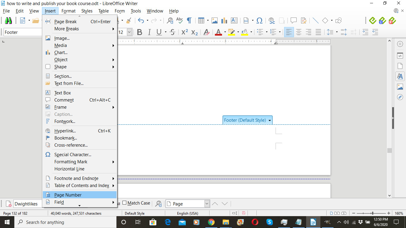 Here’s how you insert page numbers. Place your cursor in the footer area.