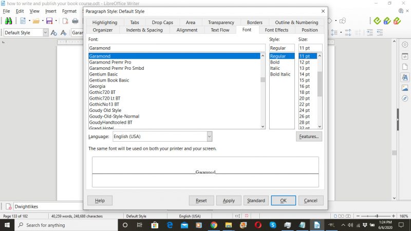 Start in the font tab. Select a font. This is the main font used in the book. There will be pages and pages of text displayed in this font, so you need to choose carefully. It needs to be a highly readable font. I recommend Garamond. I use it for most of my books. It’s very readable. I’ve also used Adobe Caslon Pro and others. Goudy is frequently recommended, and it also looks great. Here’s an article where a book designer discusses his favorite fonts for the main body of your book.